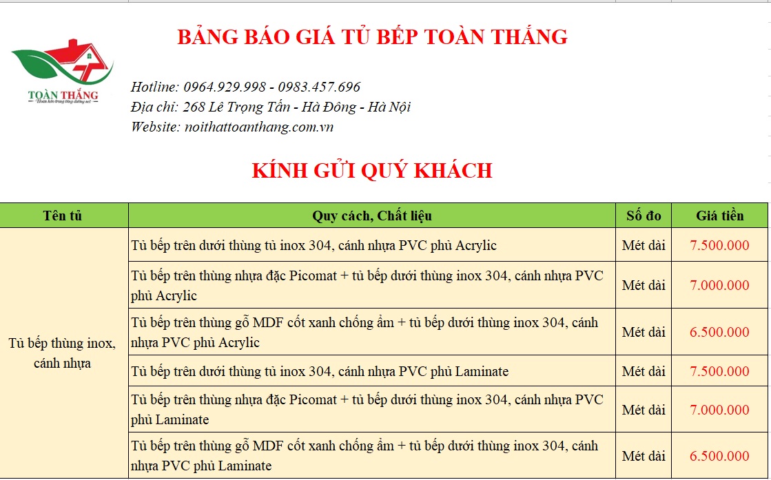 Báo giá tủ bếp Inox cánh gỗ nhựa nội thất Toàn Thắng