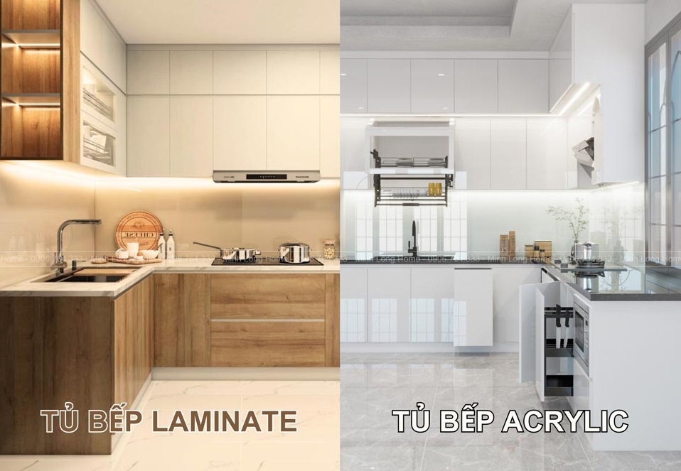 Trong khi Laminate có bề mặt nhám hoặc bán bóng, cứng cáp, chống trầy xước và va đập tốt, phù hợp cho không gian bếp sử dụng nhiều. Tùy vào nhu cầu thẩm mỹ và mức độ sử dụng, bạn có thể lựa chọn loại cánh phù hợp để vừa bền vừa đẹp cho căn bếp.