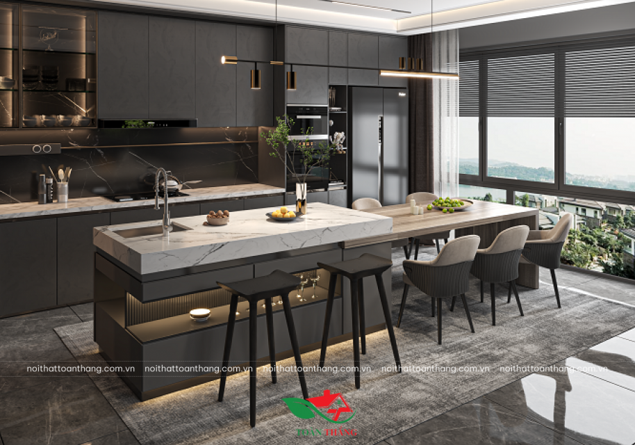 Sự đồng bộ màu sắc giữa tủ bếp, đảo bếp và hệ tủ cao mang lại cảm giác sang trọng, liền mạch, kết hợp ánh sáng đèn LED âm trần và đèn thả giúp không gian thêm chiều sâu và đẳng cấp.