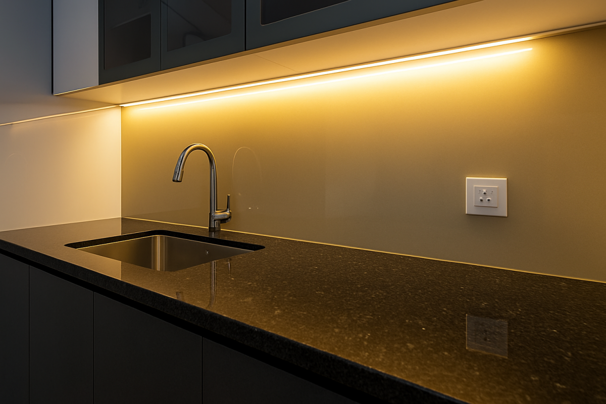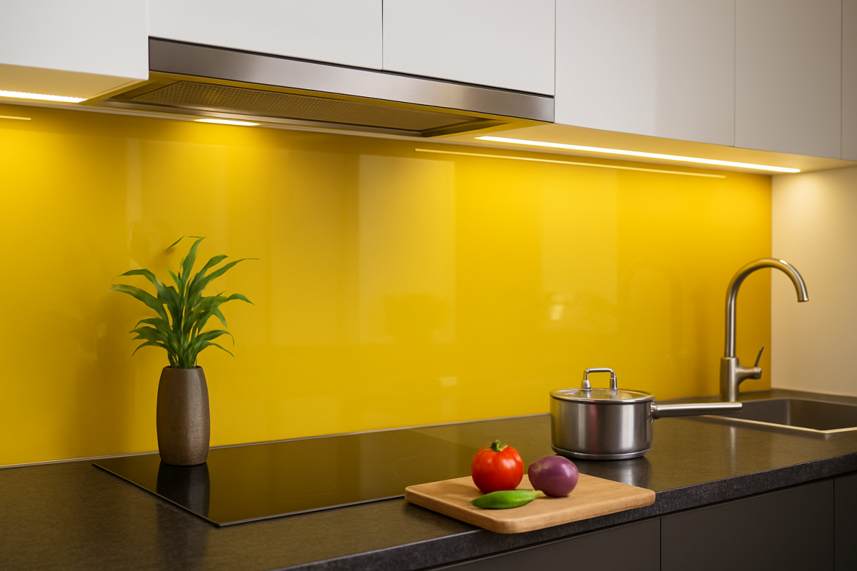 Trong cả hai hình ảnh, tone vàng chanh của kính ốp bếp lập tức thu hút ánh nhìn. Đây là màu sắc tạo cảm giác ấm áp – sạch sẽ – tràn năng lượng, rất lý tưởng cho không gian nấu ăn.