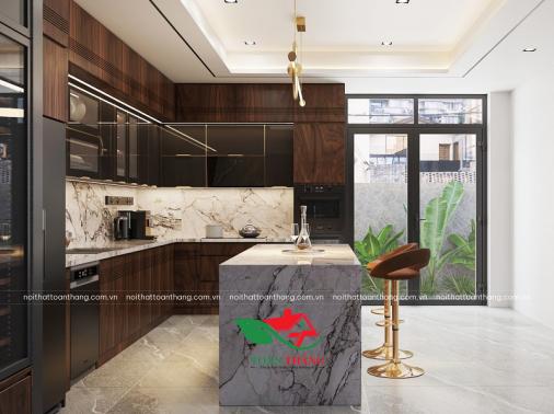 Tủ bếp gỗ óc chó hiện đại kết hợp đảo bếp sang trọng, tối ưu công năng