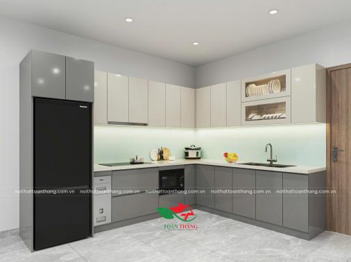 Tủ Bếp Acrylic An Cường Xám Tro Phối Kính Xanh Ngọc