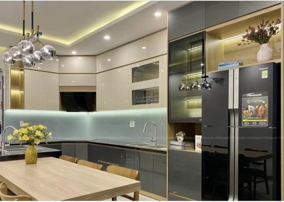 Đối với các căn hộ chung cư có diện tích hạn chế, tủ bếp Acrylic màu be là “giải pháp vàng” giúp không gian trở nên sáng và rộng hơn. Nhờ gam màu trung tính kết hợp bề mặt bóng gương, ánh sáng được phản chiếu tốt hơn, tạo cảm giác thoáng đãng.