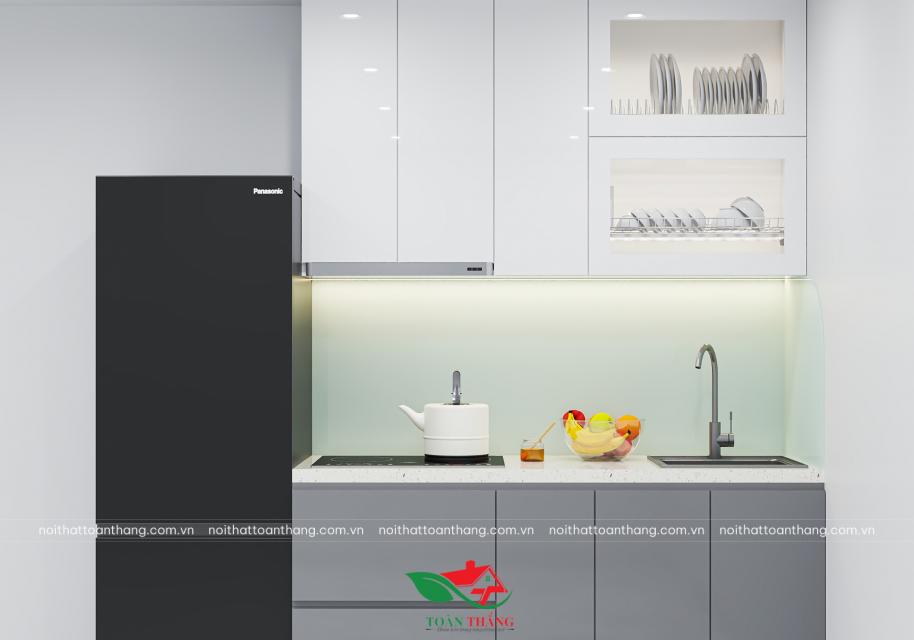 Khu vực mặt bếp: sử dụng đá thạch anh trắng vân mịn, chống bám bẩn, dễ vệ sinh và chịu nhiệt tốt.