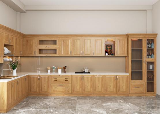 Tủ bếp gỗ tự nhiên chữ L được làm từ các loại gỗ như sồi, óc chó, xoan đào hoặc gõ đỏ, nổi bật với độ bền cao, khả năng chịu lực tốt và tuổi thọ lâu dài.