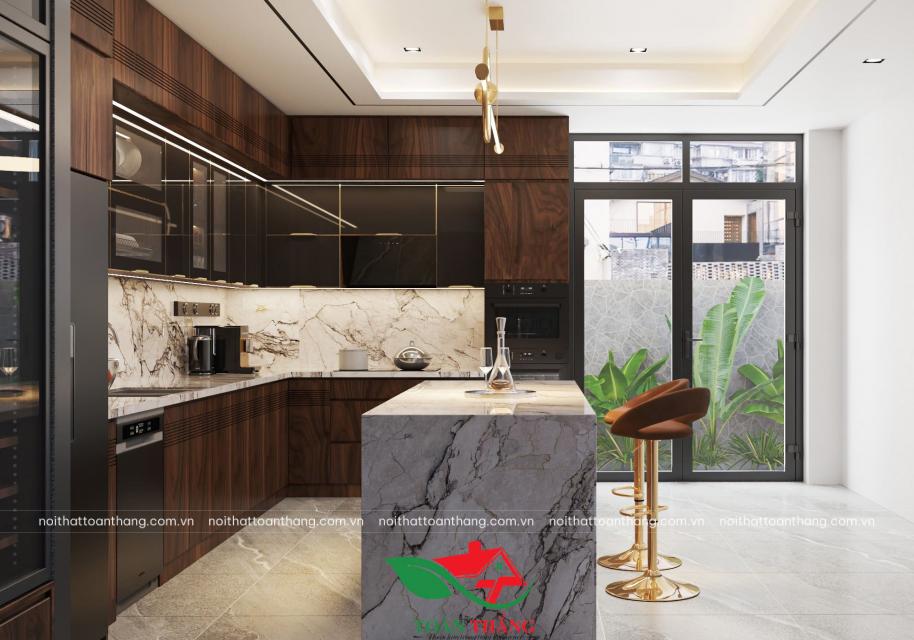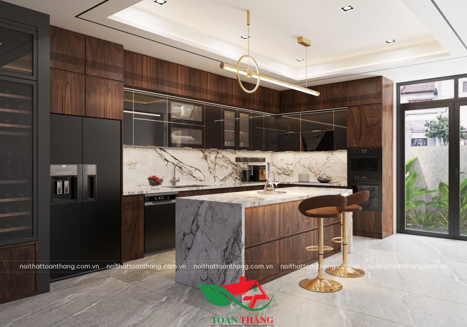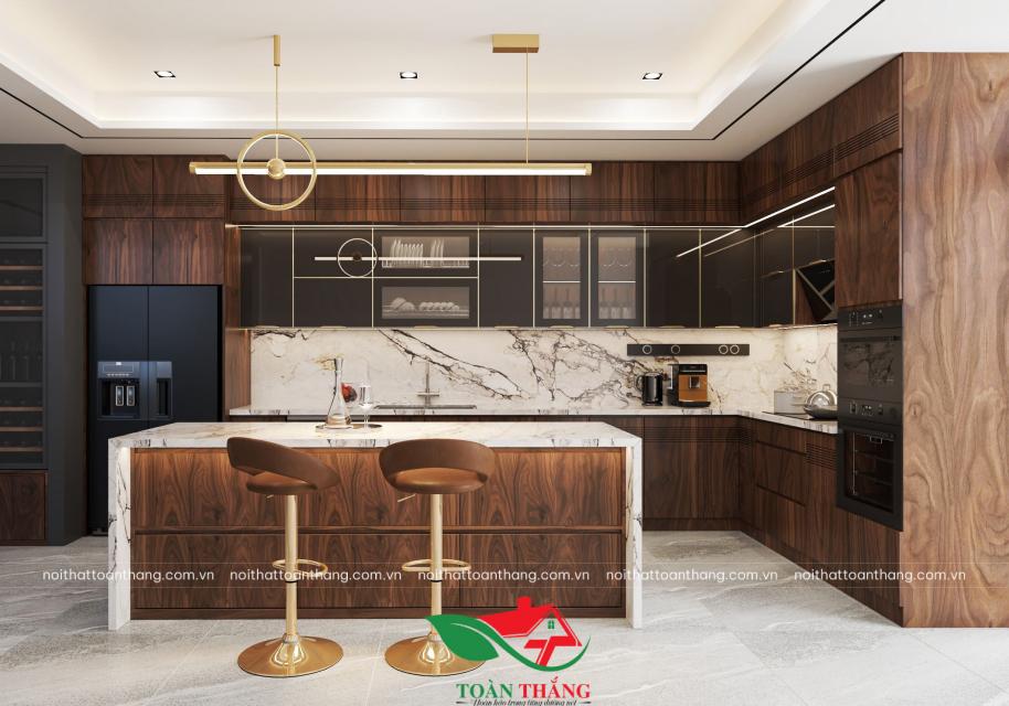 Tủ bếp gỗ óc chó hiện đại kết hợp đảo bếp sang trọng, tối ưu công năng