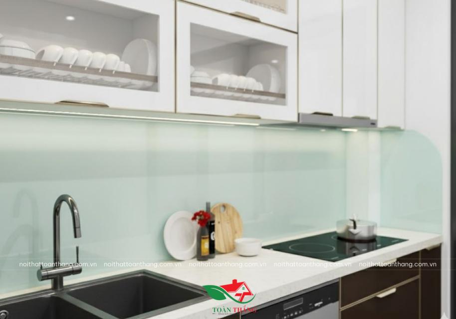 Phần tủ dưới sử dụng cánh kính màu nâu chocolate, tạo cảm giác chắc chắn, sạch sẽ và sang trọng. Trong khi đó, tủ trên lại là kính trắng bóng, giúp toàn bộ không gian bếp trông nhẹ nhàng và cao ráo hơn.