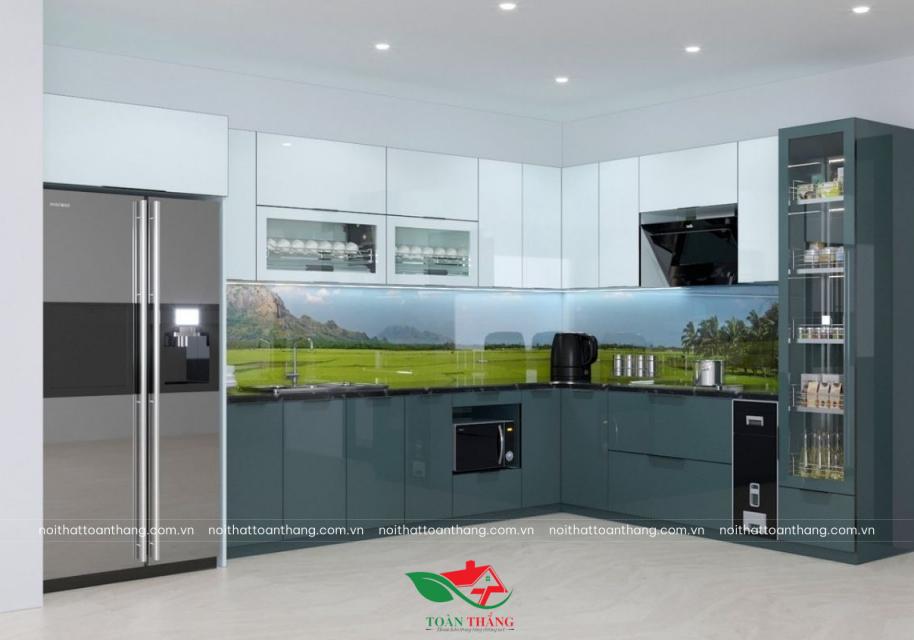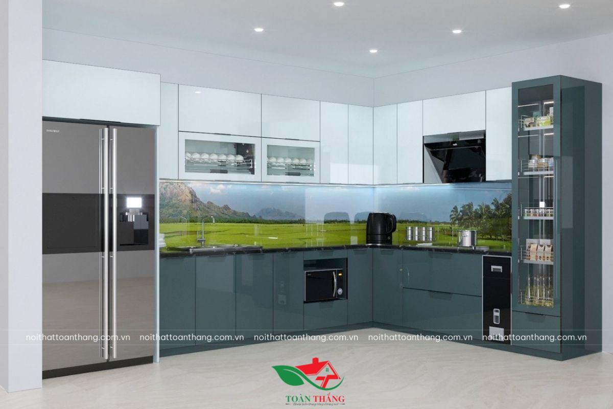 Mẫu tủ bếp inox cánh kính chữ L phối màu xanh ngọc tinh tế