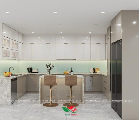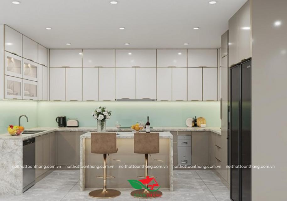 Tổng thể căn bếp được thiết kế theo bố cục chữ U kết hợp đảo bếp trung tâm, giúp tối ưu diện tích sử dụng, đồng thời tạo cảm giác bếp rộng rãi, thoáng và rất tiện cho sinh hoạt hằng ngày.