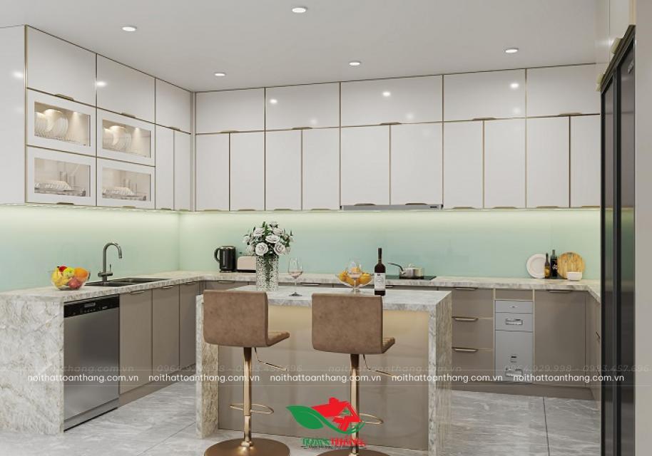 - Không gian bếp gây ấn tượng với sự phối hợp màu sắc tinh tế giữa tông trắng sứ, xám ghi và các chi tiết viền vàng gold tạo nên một không gian nấu nướng đẳng cấp và đầy cảm hứng.