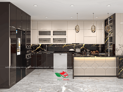 Tủ Bếp Inox Cánh Kính Kiểu Chữ L Đơn Giản Tone Màu Trắng - Đen