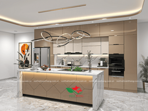 Tủ Bếp Inox Cánh Kính Tone Nâu Champagne Kết Hợp Đảo Bếp