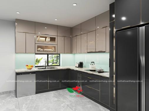Tủ Bếp Inox Cánh Kính Chữ L, Tone Xám Hiện Đại