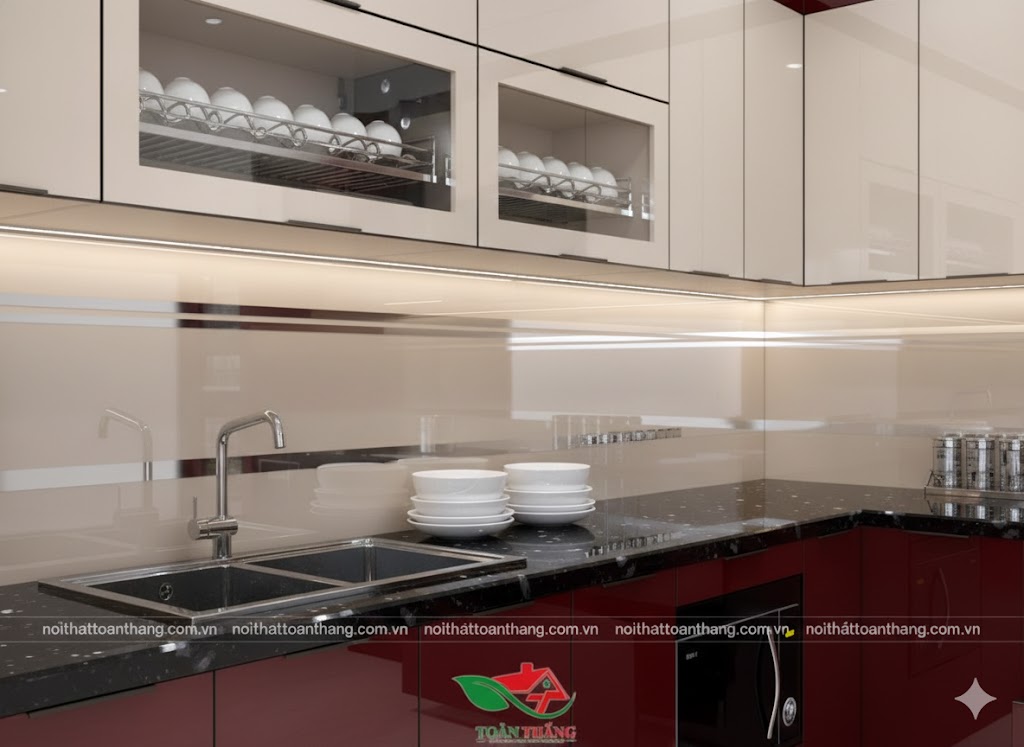 Tủ Bếp Inox 304 Mặt Cánh Kính Cường Lực Kết Hợp Màu Đỏ Đun