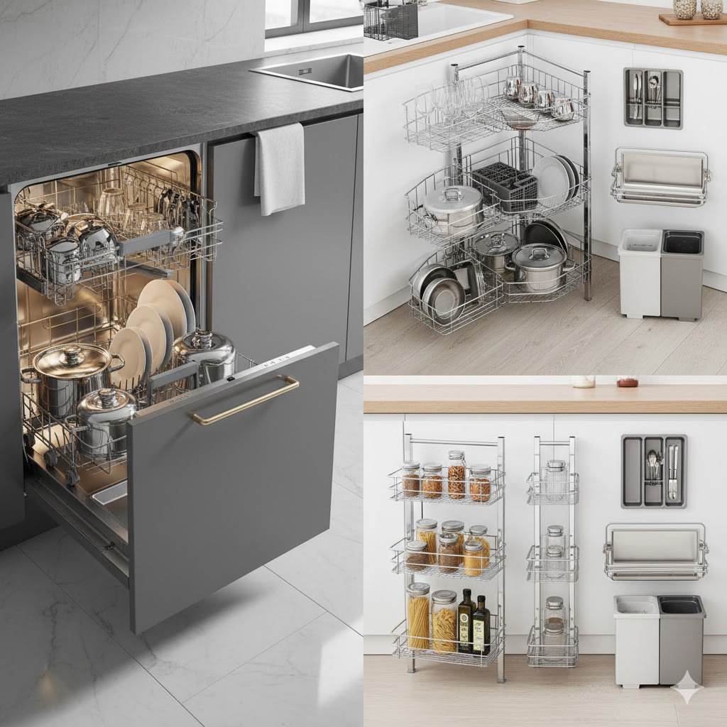 Khu Vực Phụ Kiện Ẩn: Các ngăn kéo hẹp (thường đặt cạnh bếp từ) được dùng để chứa các phụ kiện chuyên dụng như giá đựng chai lọ gia vị, khay chia thìa dĩa, đảm bảo mọi thứ đều được sắp xếp gọn gàng và dễ dàng lấy ra.