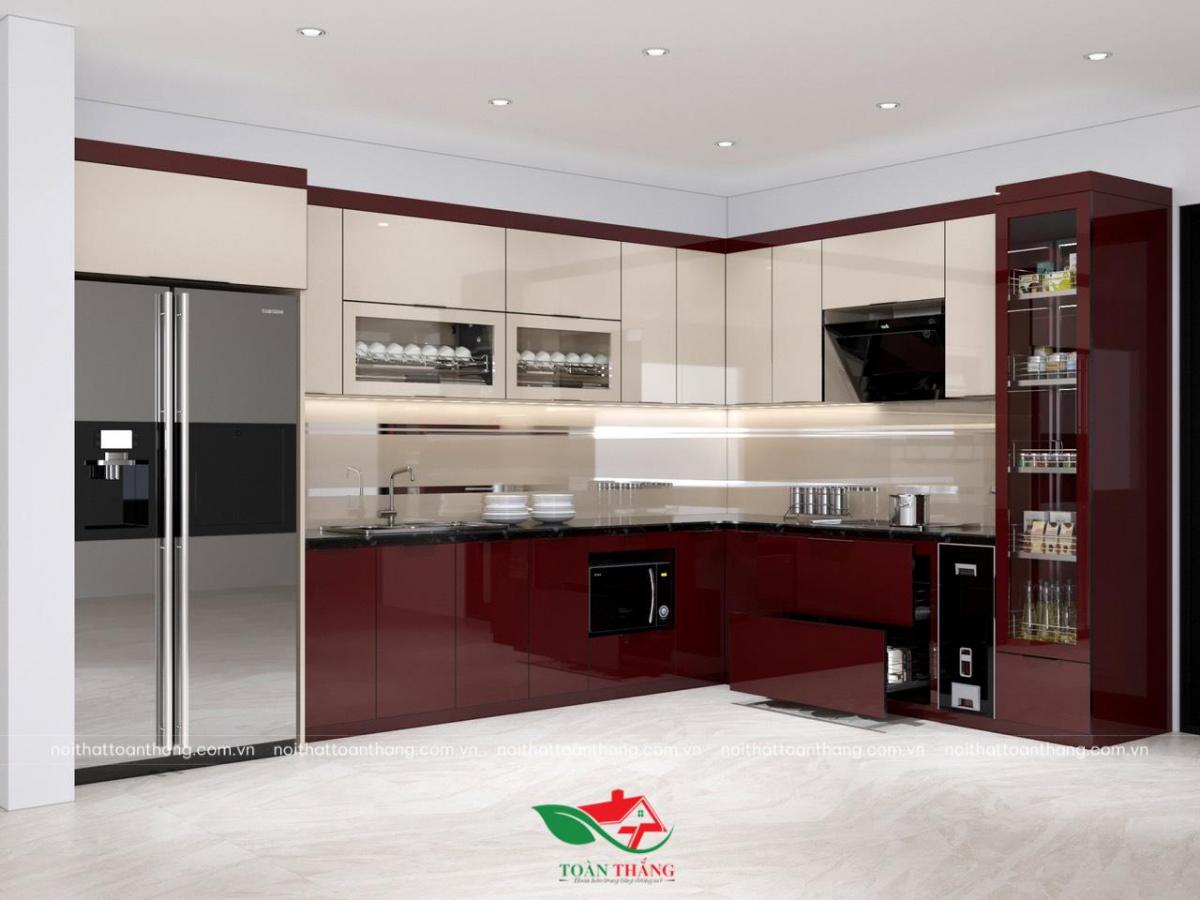 - Tông màu Beige (Vàng kem) hoặc Nude được sử dụng cho tủ trên, đóng vai trò là màu nền cân bằng, làm dịu đi sự mạnh mẽ của màu Đỏ Đun.