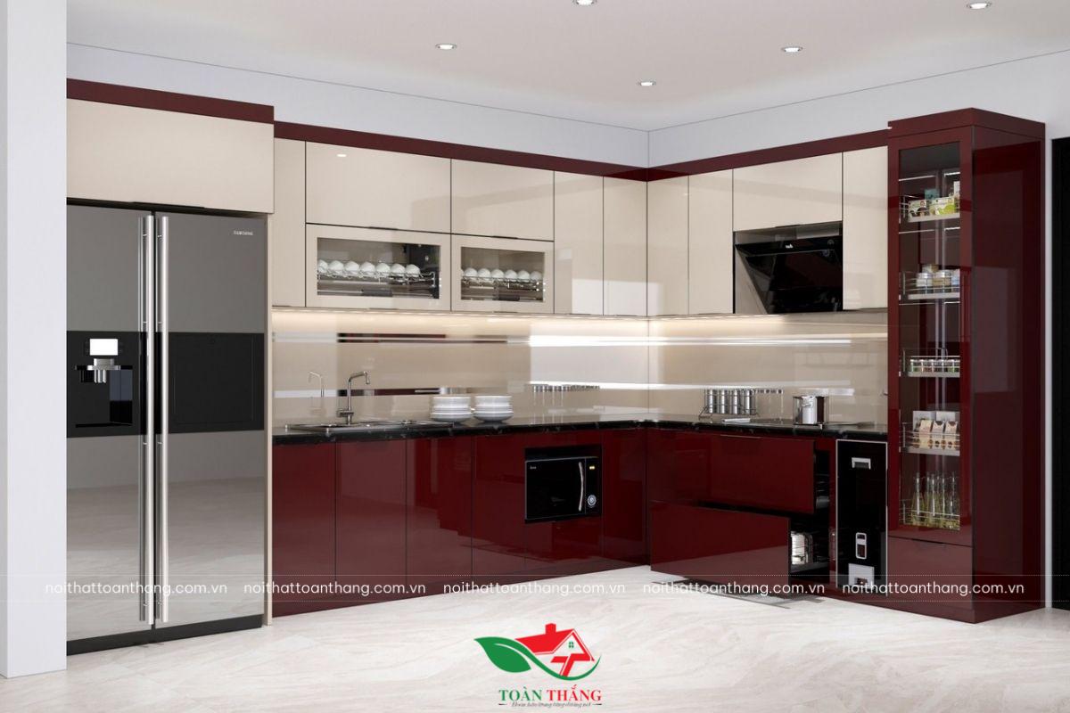 Thiết kế tủ bếp inox cánh kính chữ L phối màu đỏ trầm be