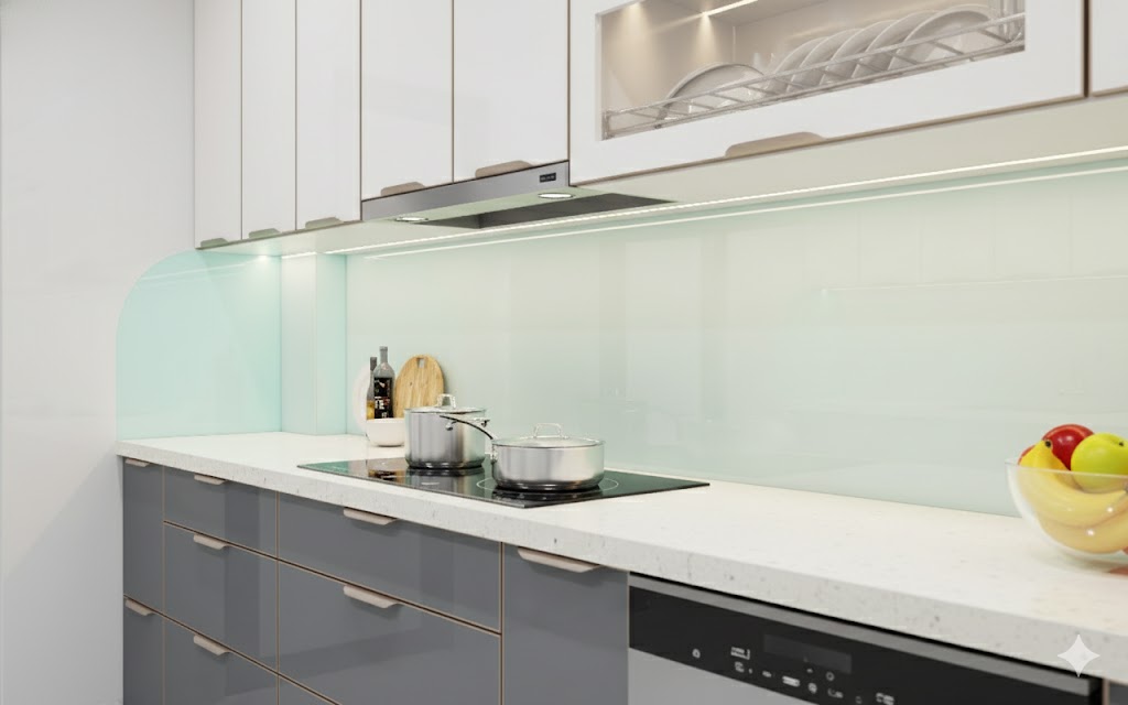 1.2. Kính Ốp Bếp Màu Xanh Mint (Xanh Bạc Hà) – Điểm Nhấn Tươi Mát