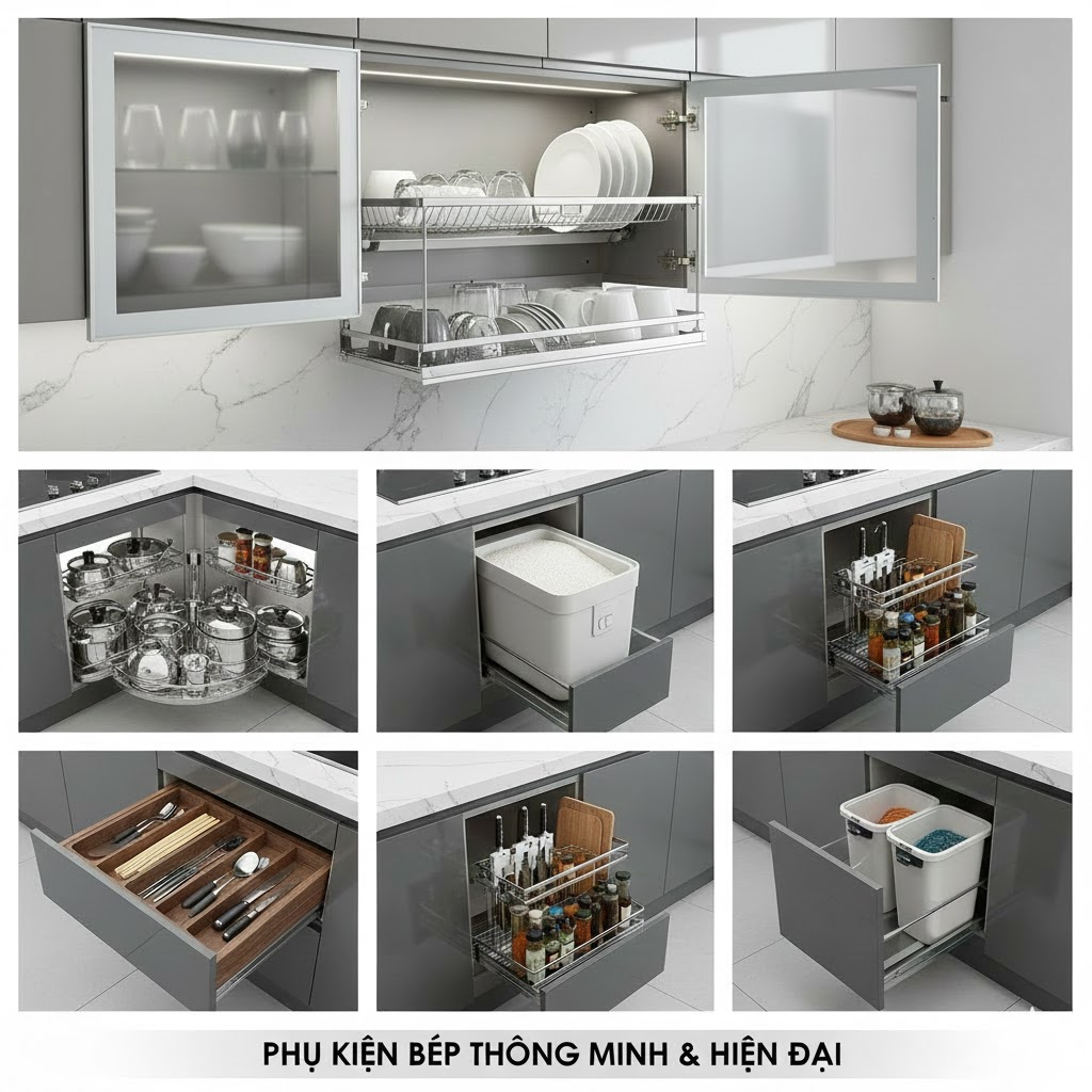 Phụ Kiện Cao Cấp: Các phụ kiện bên trong như giá bát nâng hạ, giá xoong nồi, ray trượt đều được làm từ Inox cao cấp, có khả năng chịu tải trọng lớn và vận hành êm ái, tăng cường tuổi thọ và sự tiện nghi cho tủ bếp.