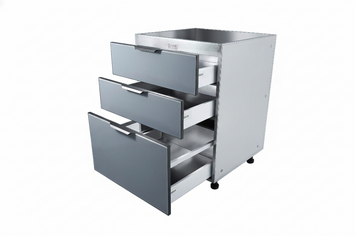Thùng Inox 304 – Chống Nước, Chống Mối Mọt Tuyệt Đối: Thùng tủ làm từ Inox SUS 304 là trái tim của sự bền bỉ. Nó kháng nước 100%, chống ẩm mốc và chống mối mọt vĩnh viễn, không bị biến dạng hay han gỉ. Đây là yếu tố cực kỳ quan trọng, đặc biệt ở khu vực chậu rửa và tủ dưới, nơi dễ bị hư hại nhất.