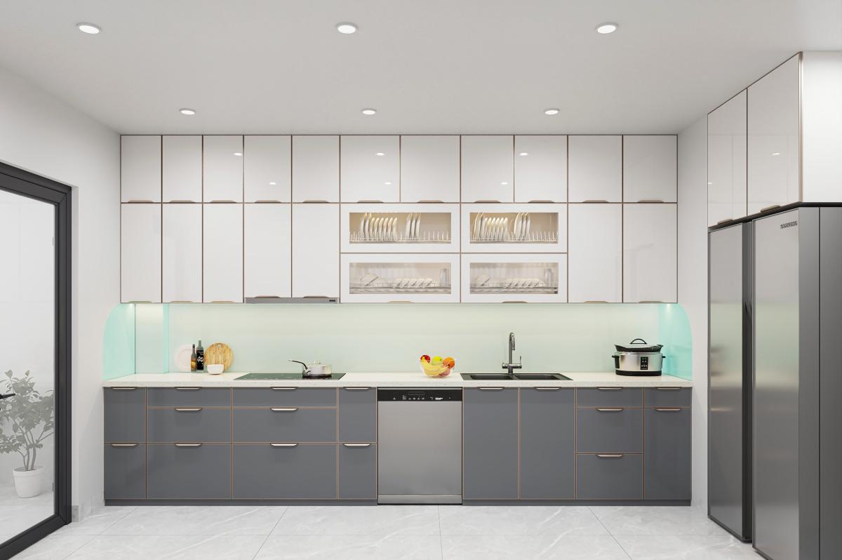 - Thiết kế tủ bếp thẳng hàng hoặc chữ I là lựa chọn hoàn hảo cho căn hộ hiện đại, tối ưu không gian và tạo sự gọn gàng.