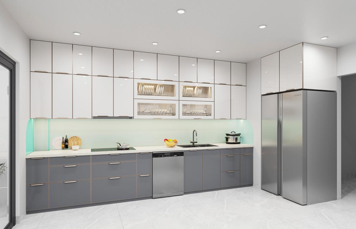 Tủ Bếp Inox Cánh Kính: Tuyệt Tác Tối Giản Với Sự Kết Hợp Trắng Tinh Khôi và Xám Đậm Hiện Đại