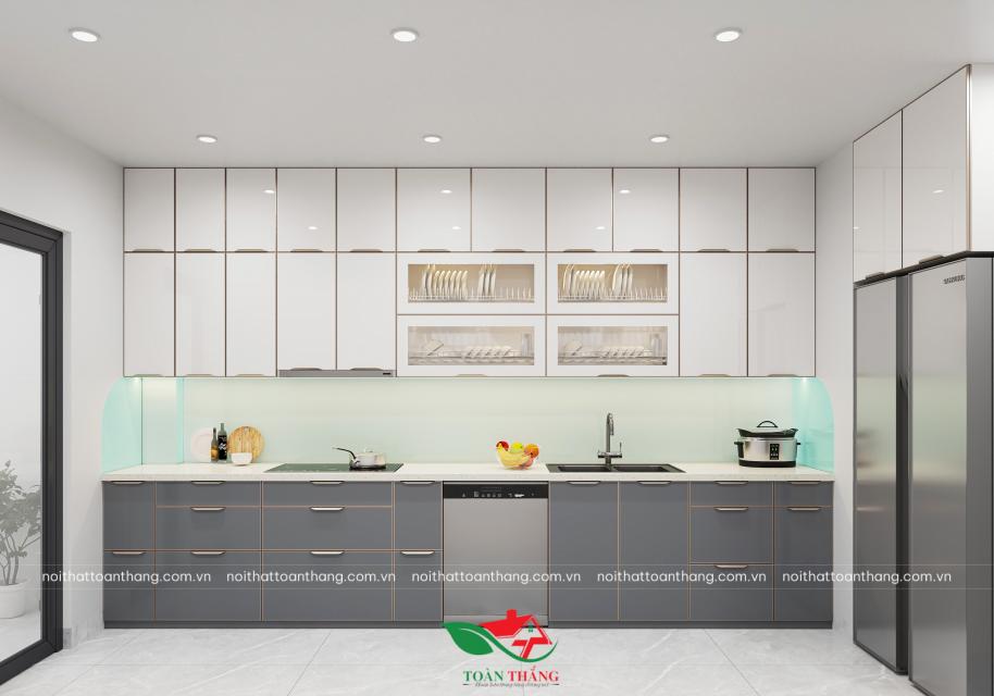 Hệ Tủ Trên Kịch Trần: Tủ trên được thiết kế kịch trần (hoặc sát trần) với nhiều module cánh mở hoặc cánh lật, tăng cường khả năng lưu trữ và tạo cảm giác không gian cao hơn, thoáng đãng hơn. Các khoang tủ có cánh kính trong suốt được dùng để trưng bày bát đĩa đẹp, thêm yếu tố thẩm mỹ cho tổng thể.