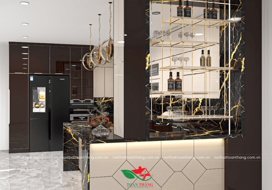 Không gian bếp kết hợp kệ rượu trưng bày đầy đủ tiện nghi