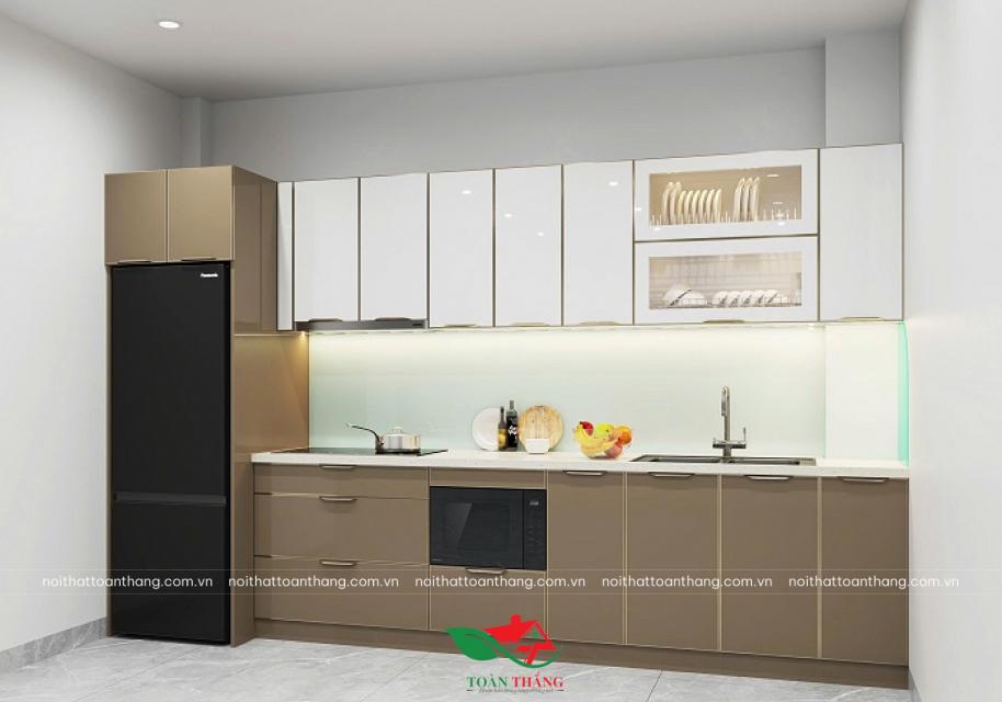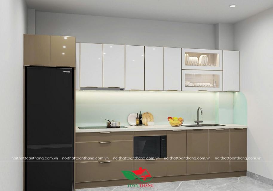 Tủ bếp inox cánh kính chữ I với phối hợp Tone màu nâu và trắng ngọc thời thượng