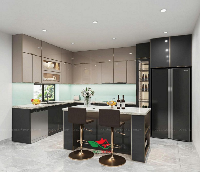 - Tủ bếp chữ L kết hợp đảo bếp trung tâm