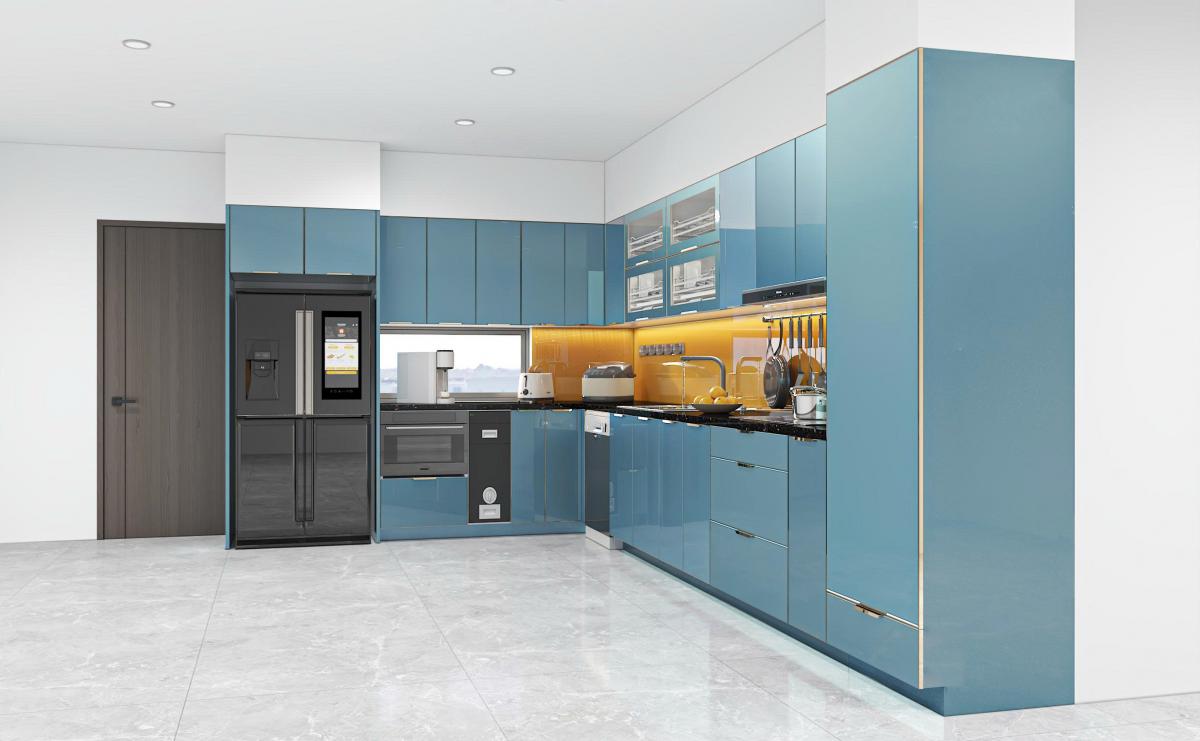 1. Bố cục chữ L rộng thoáng – Tối ưu theo chuyển động tam giác bếp