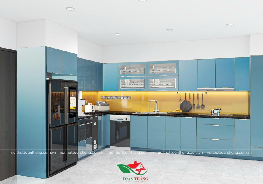 - Nền kính cường lực màu vàng đồng được lắp ở phần tường bếp giúp không gian bếp trở nên ấm áp và cao cấp. Khi ánh đèn LED hắt xuống, tông vàng hòa vào sắc xanh tạo nên một bảng màu đắt giá, gợi liên tưởng đến phong cách bếp Bắc Âu hiện đại.