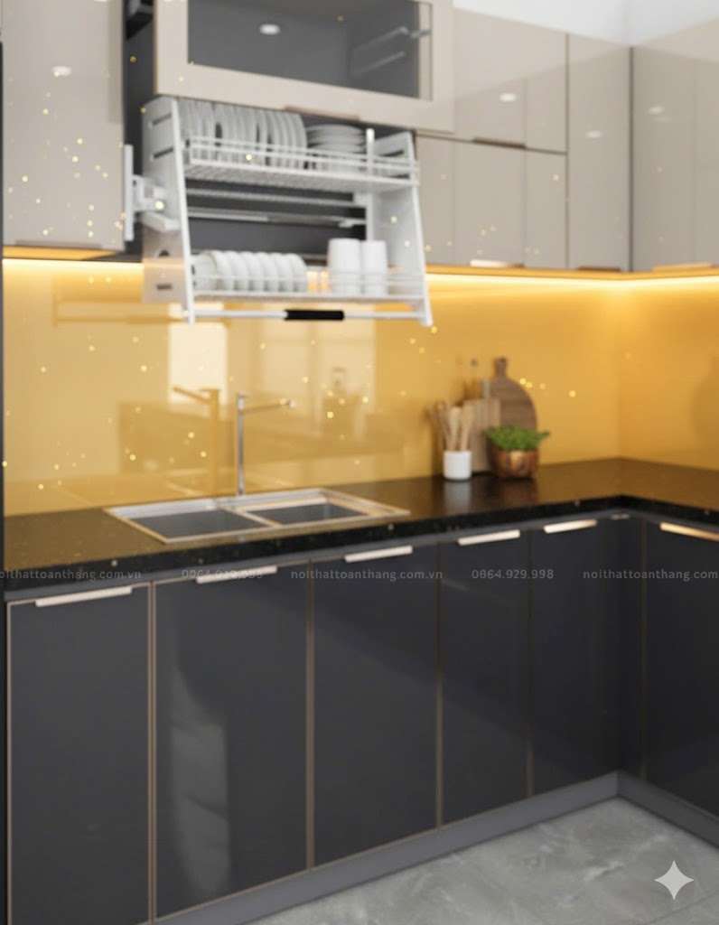 Tủ Bếp Inox Cánh Kính: Sự Giao Thoa Giữa Sắc Đen Huyền Bí Và Ánh Vàng Ấm Áp