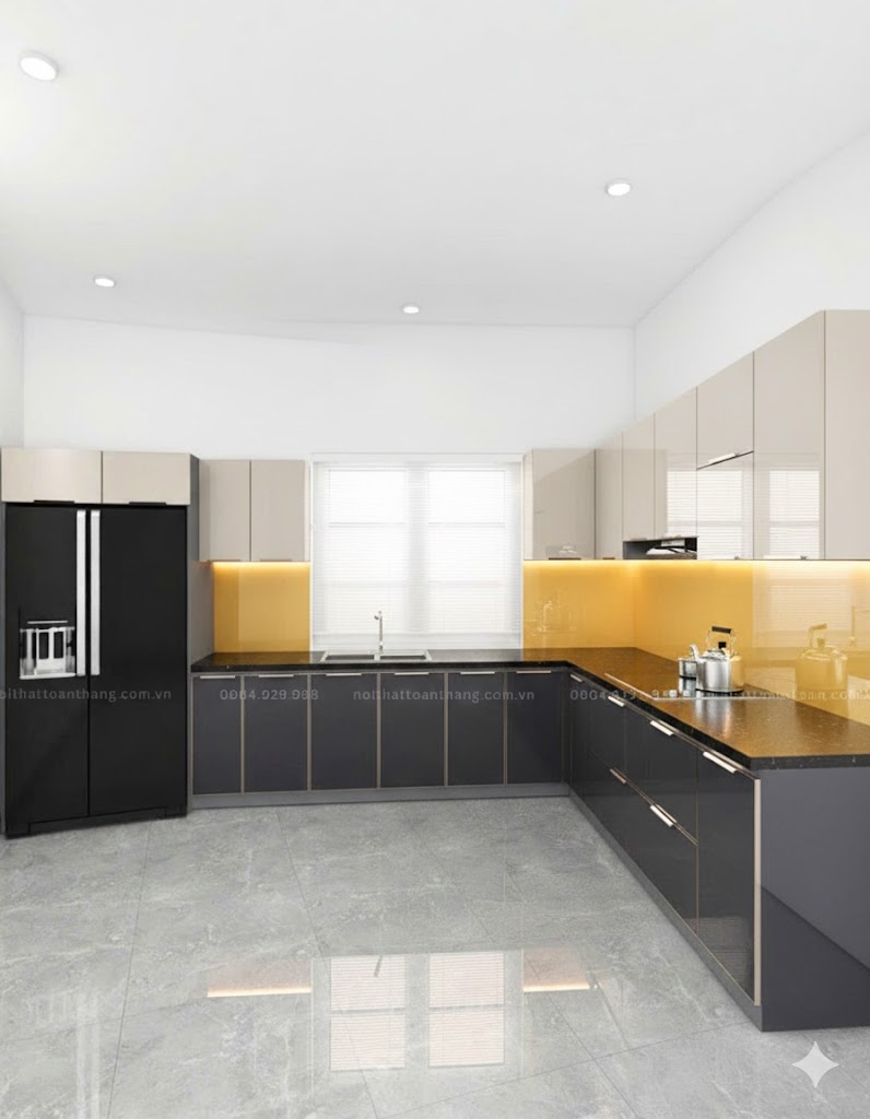 Tủ Bếp Inox Cánh Kính Đen Kết Hợp Màu Be, Mặt Kính Vàng Nổi Bật