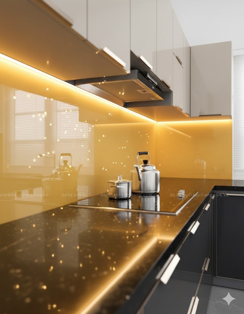1.2. "Cú hích" thị giác từ kính ốp bếp màu Vàng Mật Ong