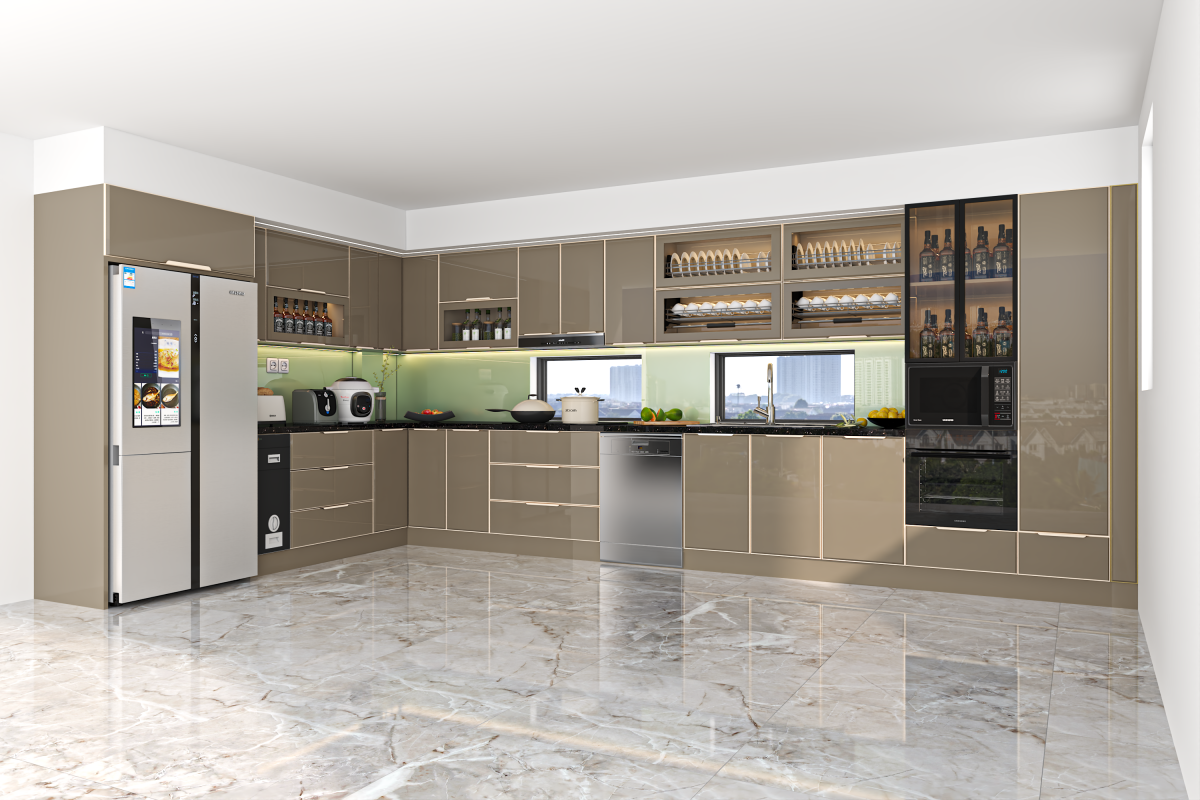 Tủ Bếp Inox Cánh Kính Hệ Tủ Module Rời Chữ L Đầy Đủ Công Năng