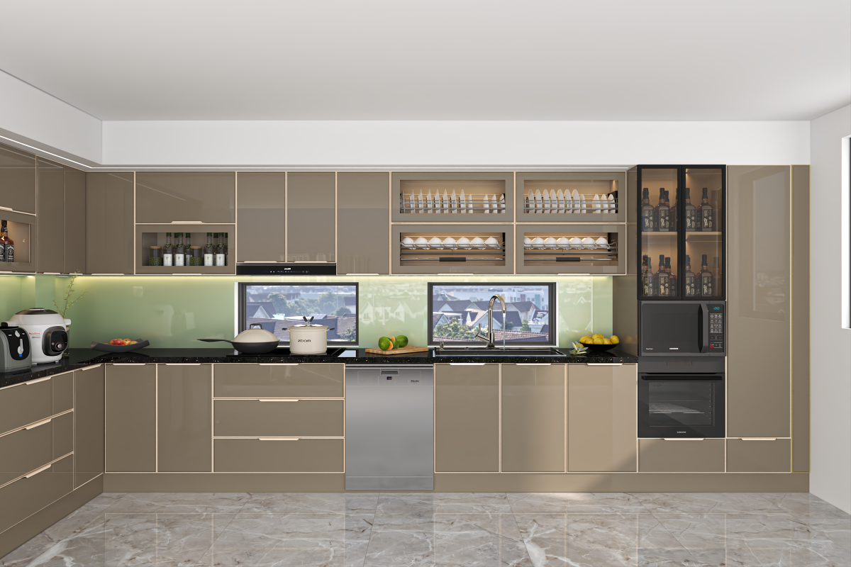 • Kính ốp bếp màu xanh ngọc / xanh mint: nhẹ nhàng, tạo cảm giác tươi mát, khiến màu nâu champagne trở nên nổi bật.