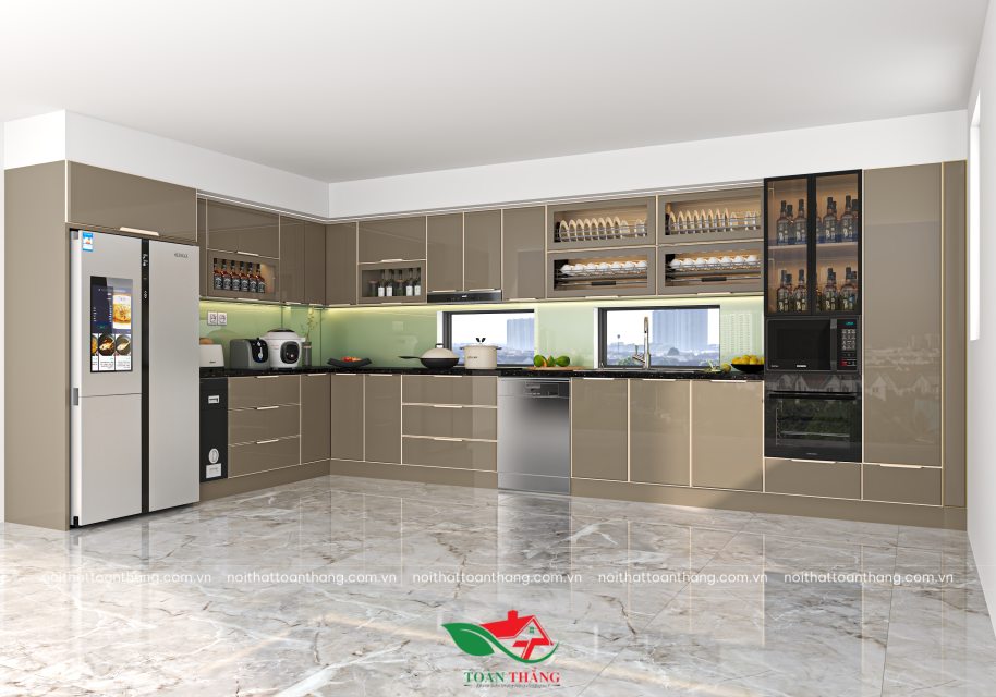 - Tông nâu champagne ánh khói đang tạo dấu ấn mạnh trong thiết kế tủ bếp cao cấp. Đây là màu sắc kết hợp giữa độ ấm của tông nâu và sự sang trọng của ánh kim nhẹ, mang lại cảm giác: