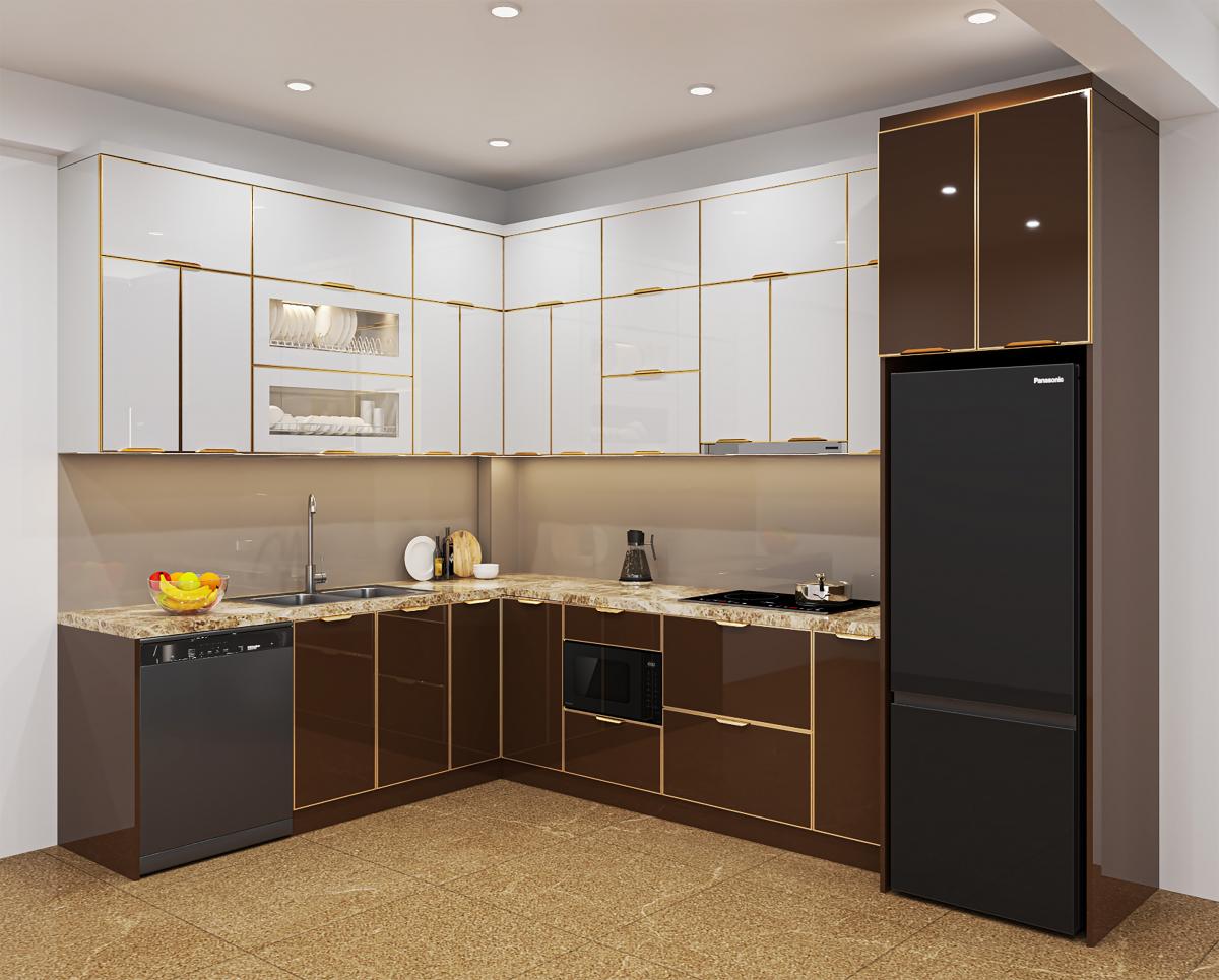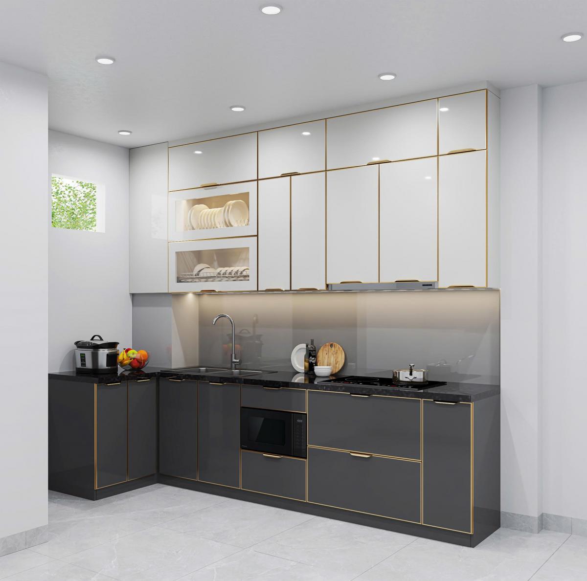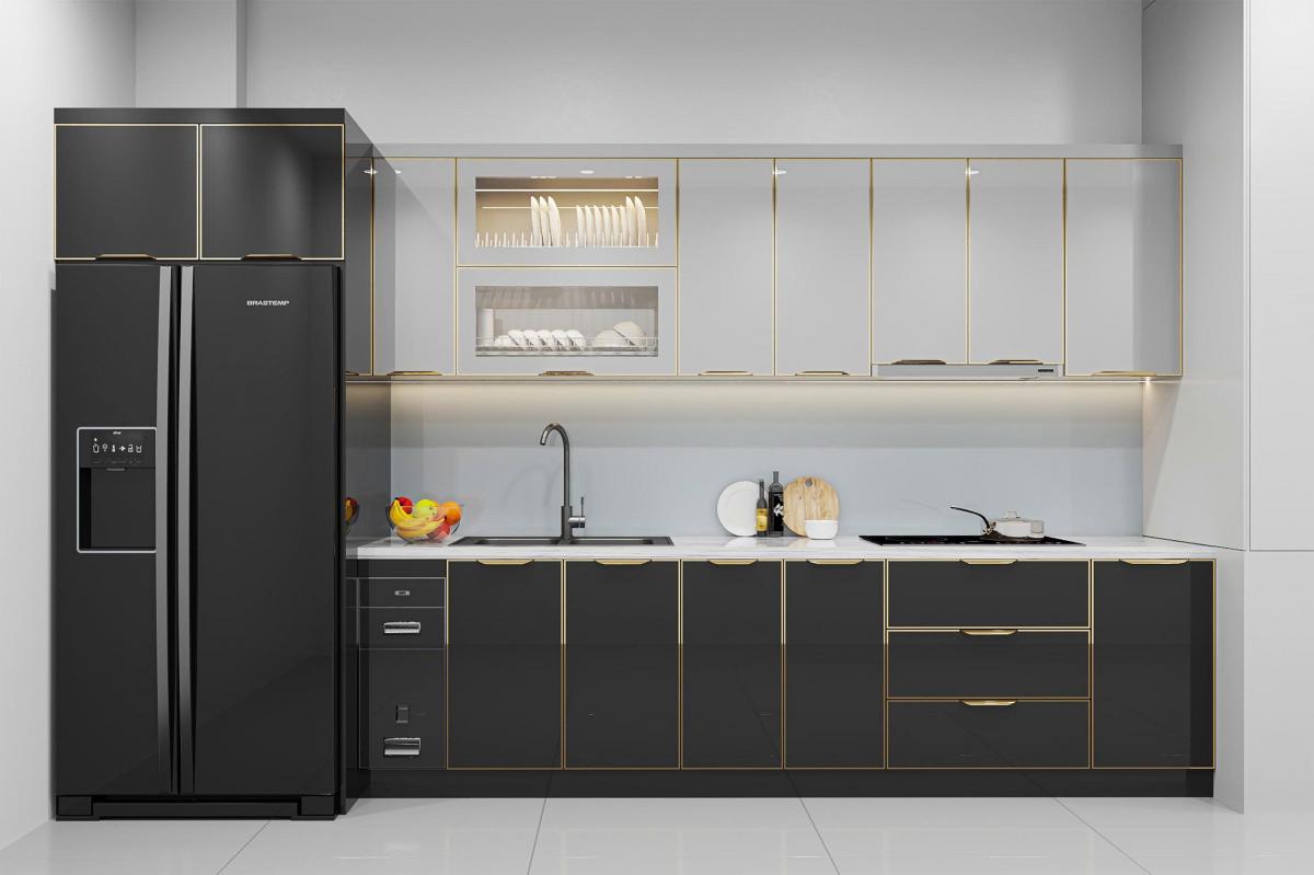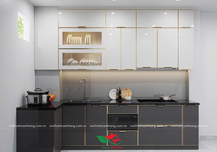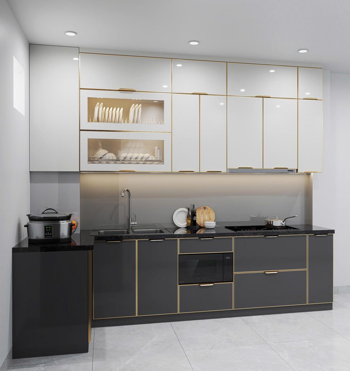 - Màu sắc sang trọng: trắng ngọc – xám ghi – vàng champagne, kết hợp đường viền ánh kim nổi bật, giúp căn bếp trở nên hiện đại và đẳng cấp như không gian châu Âu.