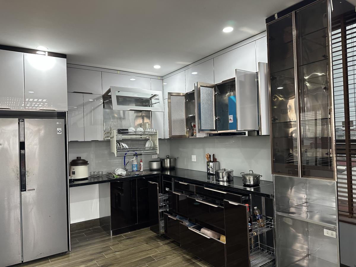 - Phần tủ dưới gồm khoang chậu rửa lớn, khu vực đặt máy rửa bát, các khoang thùng gạo, dao thớt và xoong nồi được sắp xếp hợp lý theo quy trình nấu.