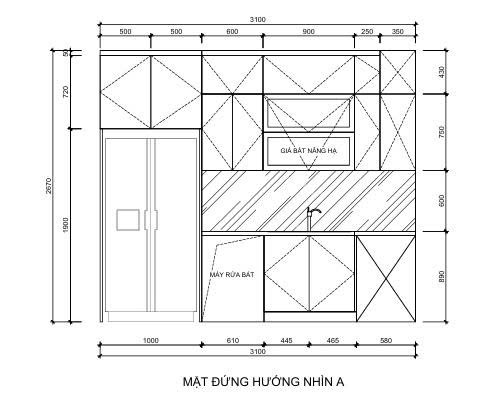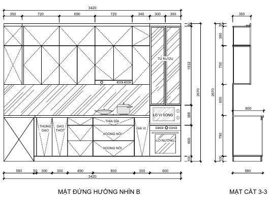 - Bản vẽ mặt đứng tủ bếp thể hiện một bố cục công năng khoa học, tối ưu theo tiêu chuẩn bếp hiện đại.