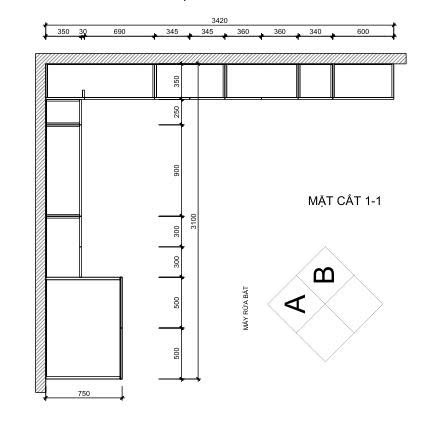 - Bản vẽ cũng thể hiện cấu tạo góc L, vị trí các khoang liên tiếp, cũng như khu vực bố trí máy rửa bát và chậu rửa.