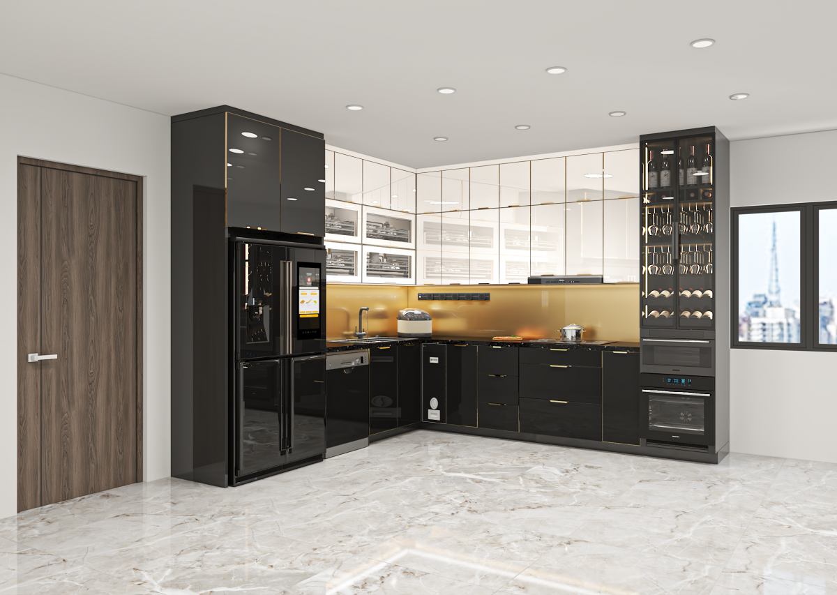 - Dáng bếp chữ L cũng tạo đủ không gian cho các thiết bị hiện đại như bếp từ, chậu rửa, máy rửa bát, tủ lạnh side-by-side hay lò nướng âm tủ.
