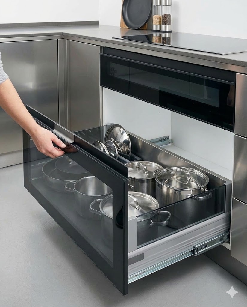 Khu vực lưu trữ thông minh: Hình ảnh 1 cho thấy rõ một phụ kiện quan trọng: Giá bát nâng hạ. Đây là phụ kiện dành cho tủ trên, giúp người dùng (kể cả người có chiều cao khiêm tốn) dễ dàng kéo bát đĩa xuống tầm mắt để lấy hoặc cất mà không cần kiễng chân. Bên cạnh đó, các ngăn kéo ở tủ dưới hứa hẹn chứa các khay chia thìa dĩa, xoong nồi được ray trượt giảm chấn êm ái.