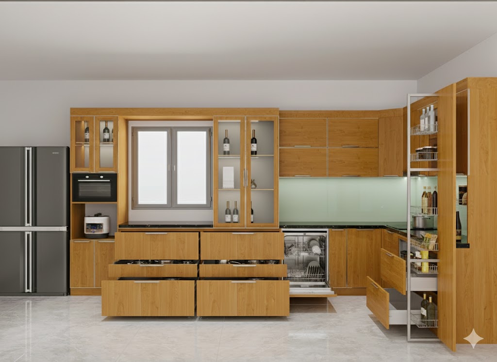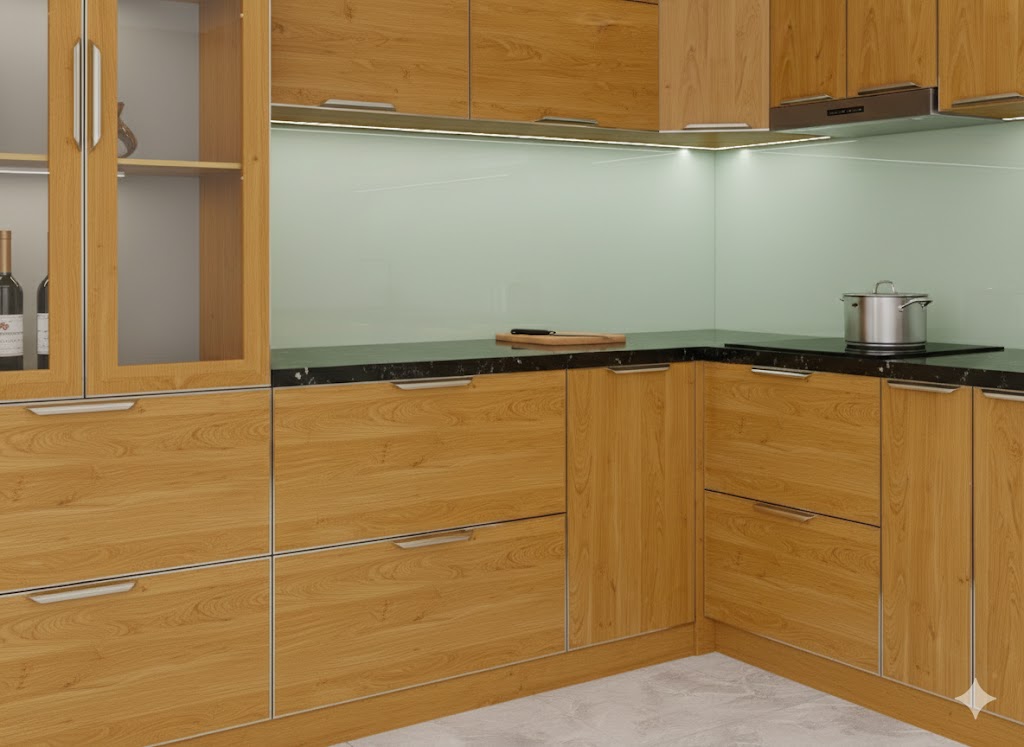 Vệ Sinh Nhanh Chóng: Khác với bề mặt gỗ (cần bảo trì cẩn thận), bề mặt cánh kính bóng láng giúp việc lau chùi dầu mỡ trở nên dễ dàng, giữ gìn vẻ đẹp như mới của vân gỗ mà không tốn nhiều công sức.