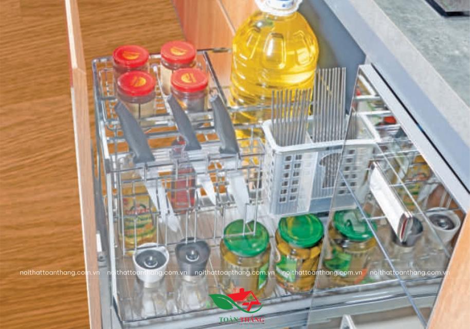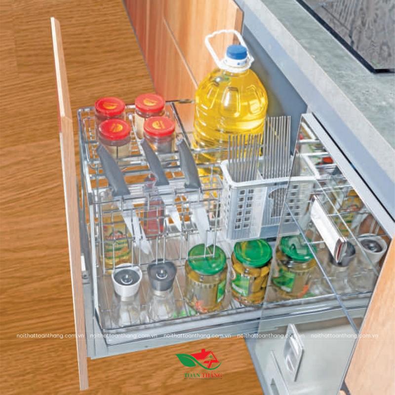 Công dụng: Dùng để đựng dao, thớt, thìa, đũa, chai lọ, gia vị. Kệ có các size to, nhỏ lượng đựng gia vị, chai lọ khác nhau. Kệ có thể dùng gắn cánh hoặc âm tủ.