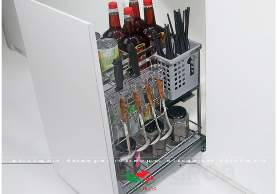 Công dụng: Dùng để đựng dao, thớt, thìa, đũa, chai lọ, gia vị. Kệ có các size to, nhỏ lượng đựng gia vị, chai lọ khác nhau. Kệ có thể dùng gắn cánh hoặc âm tủ.