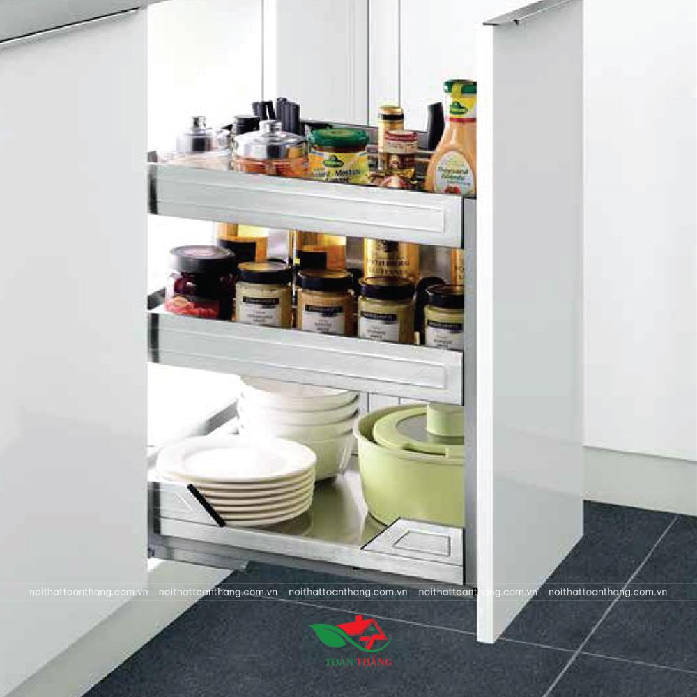 Công dụng: Dùng để đựng dao, thớt, thìa, đũa. Kệ có các size to, nhỏ lượng để phù hợp với kích thước đựng gia vị, chai lọ khác nhau. Kệ có thể dùng gắn cánh hoặc âm tủ.
