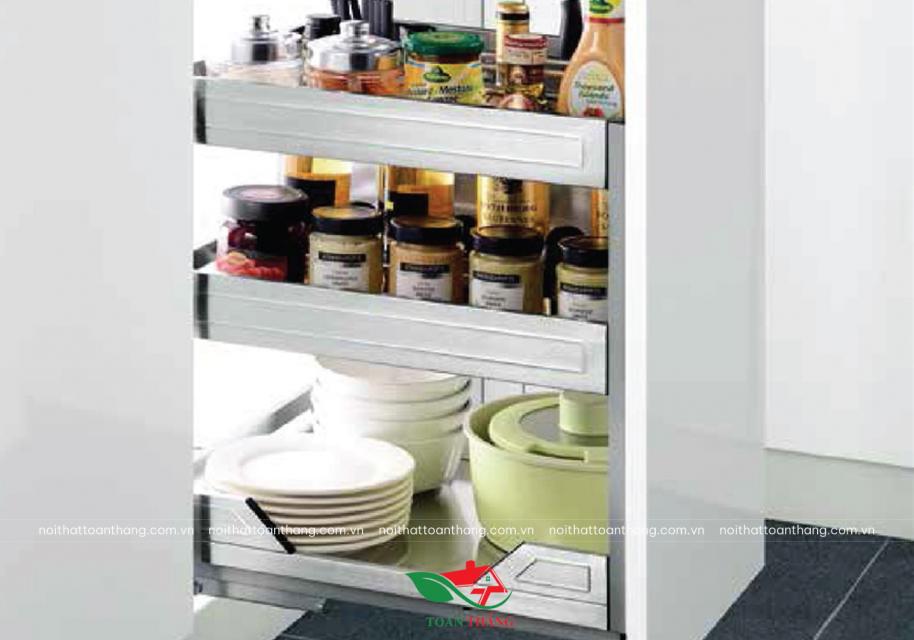 Công dụng: Dùng để đựng dao, thớt, thìa, đũa. Kệ có các size to, nhỏ lượng để phù hợp với kích thước đựng gia vị, chai lọ khác nhau. Kệ có thể dùng gắn cánh hoặc âm tủ.