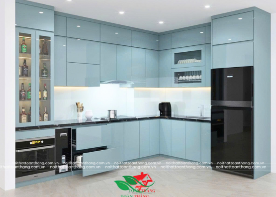 Chị Chung ở Hoài Đức đã rất hài long khi được công ty Toàn Thắng bàn giao bộ tủ bếp Picomat cánh Acrylic màu xanh tuyệt đẹp. Tủ bếp nhựa Picomat là nội thất rất được ưa chuộng, với các ưu điểm như khả năng chống nước, chống mối mọt, ẩm mốc, dễ dàng vệ sinh, … khiến cho sản phẩm này vô cùng bán chạy.